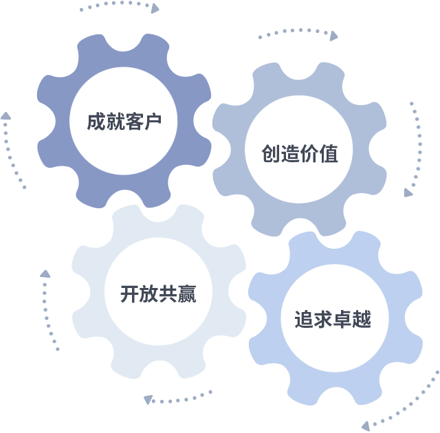 成就客户是一切决策的出发点,创造价值是衡量所有工作的标准,追求卓越是赢天堂做事做人的态度,开放共赢是赢天堂的格局也是最终的结果。价值观的齿轮环环相扣,推动着组织里的每个人不断向前。